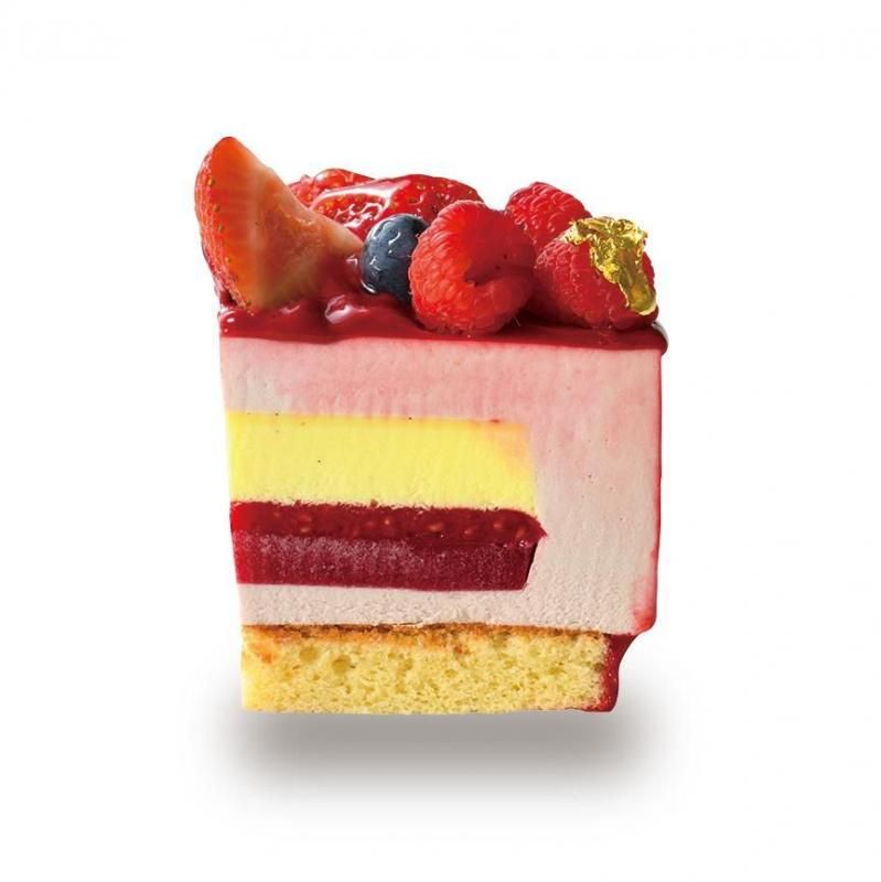 ライチとフランボワーズのジュレ、タヒチ産バニラが香るクレームブリュレ、フランボワーズのコンポートを、フルーティーな酸味のルビーチョコレートのムースで包みました。